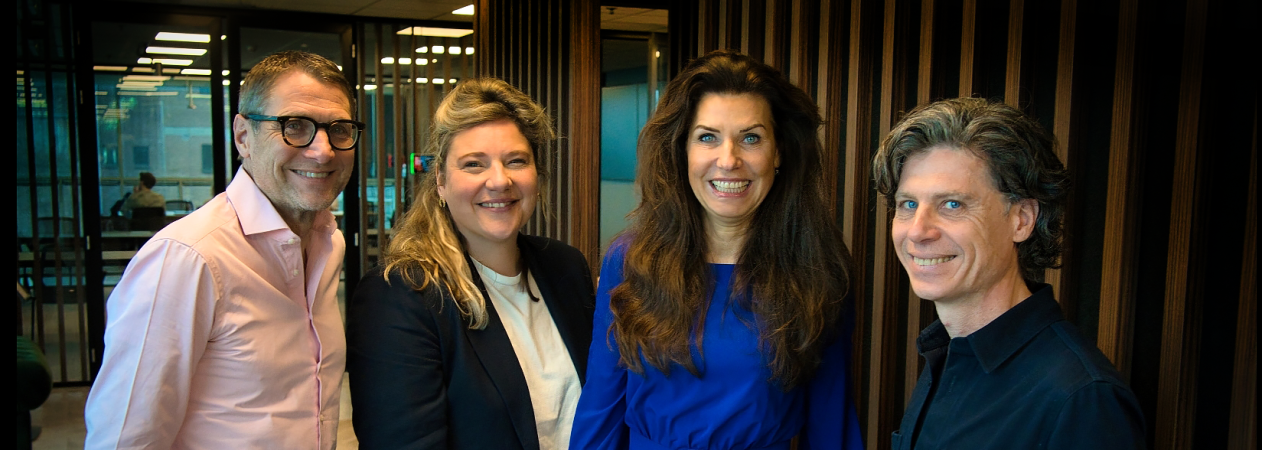 v.l.n.r. Jeroen de Bakker (Airborne), Dominique Henskens en Madelon Fortuin (beiden Mediahuis NRC) en Marvin Jacobs (Airborne)