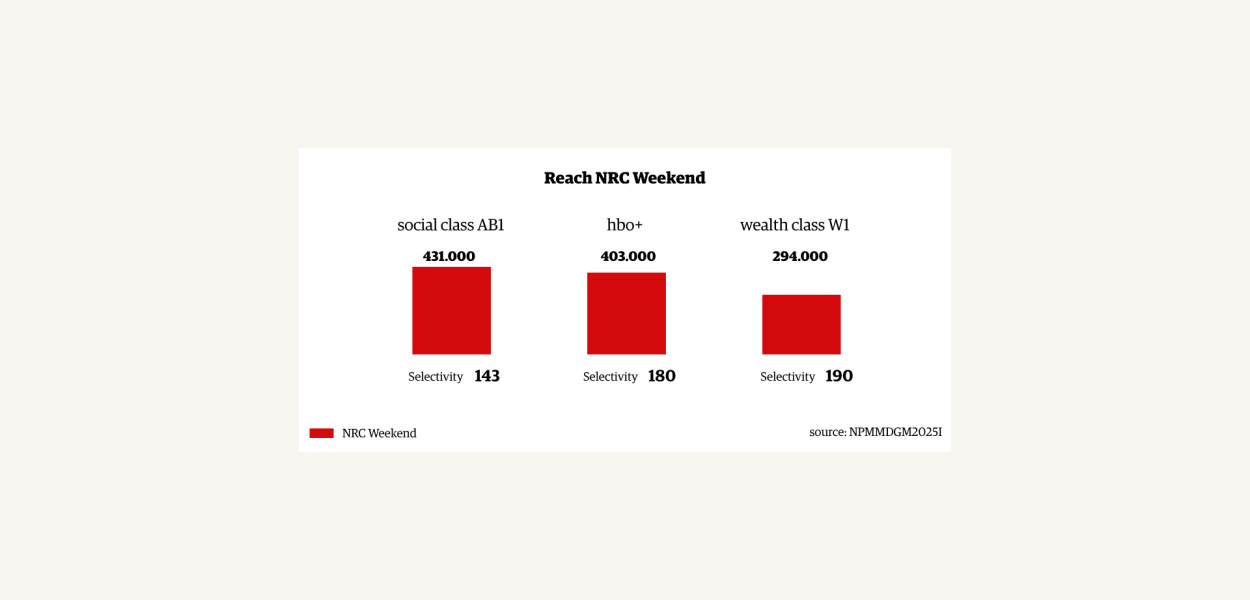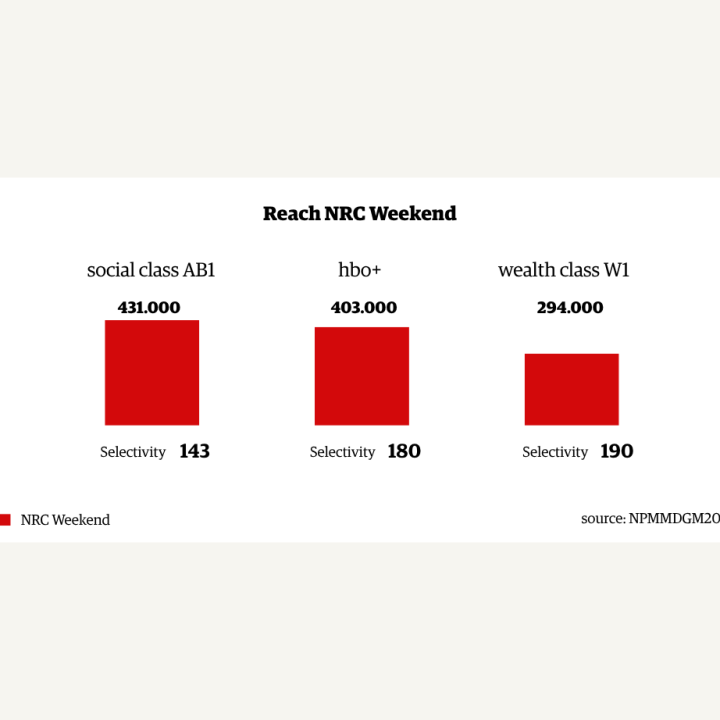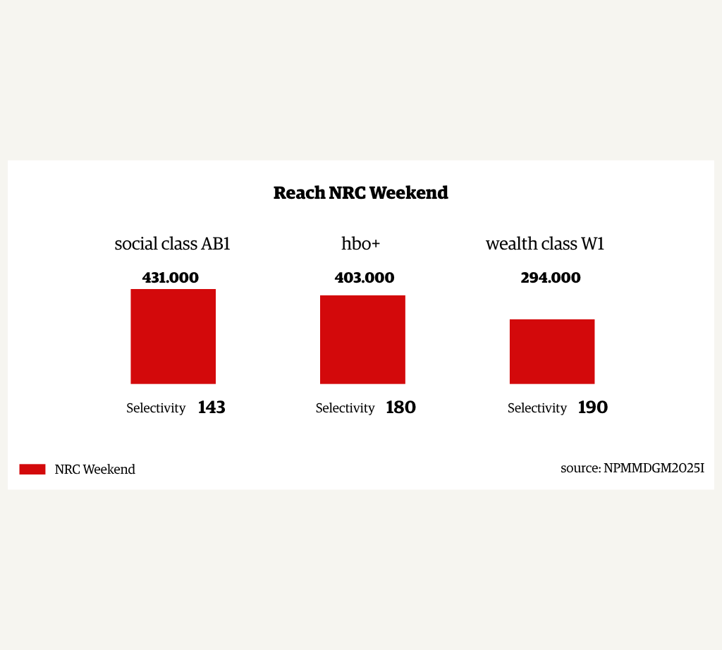 NRC Weekend offers readers the space to take a deeper look at daily news, analysis, and context. With 571,000 readers and an average reading time of 68 minutes, it’s the moment when the NRC audience makes time for in-depth journalism. In NRC Weekend, readers find not only news, opinion, and background stories but also broader perspectives — from economics and science to culture and sports.