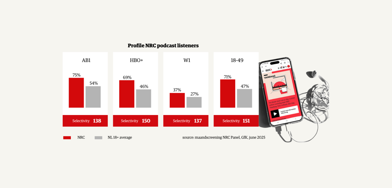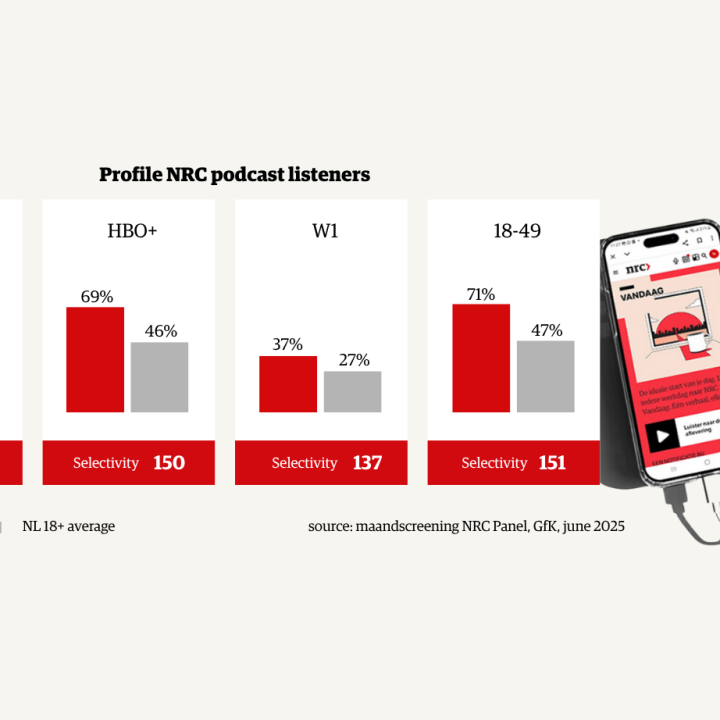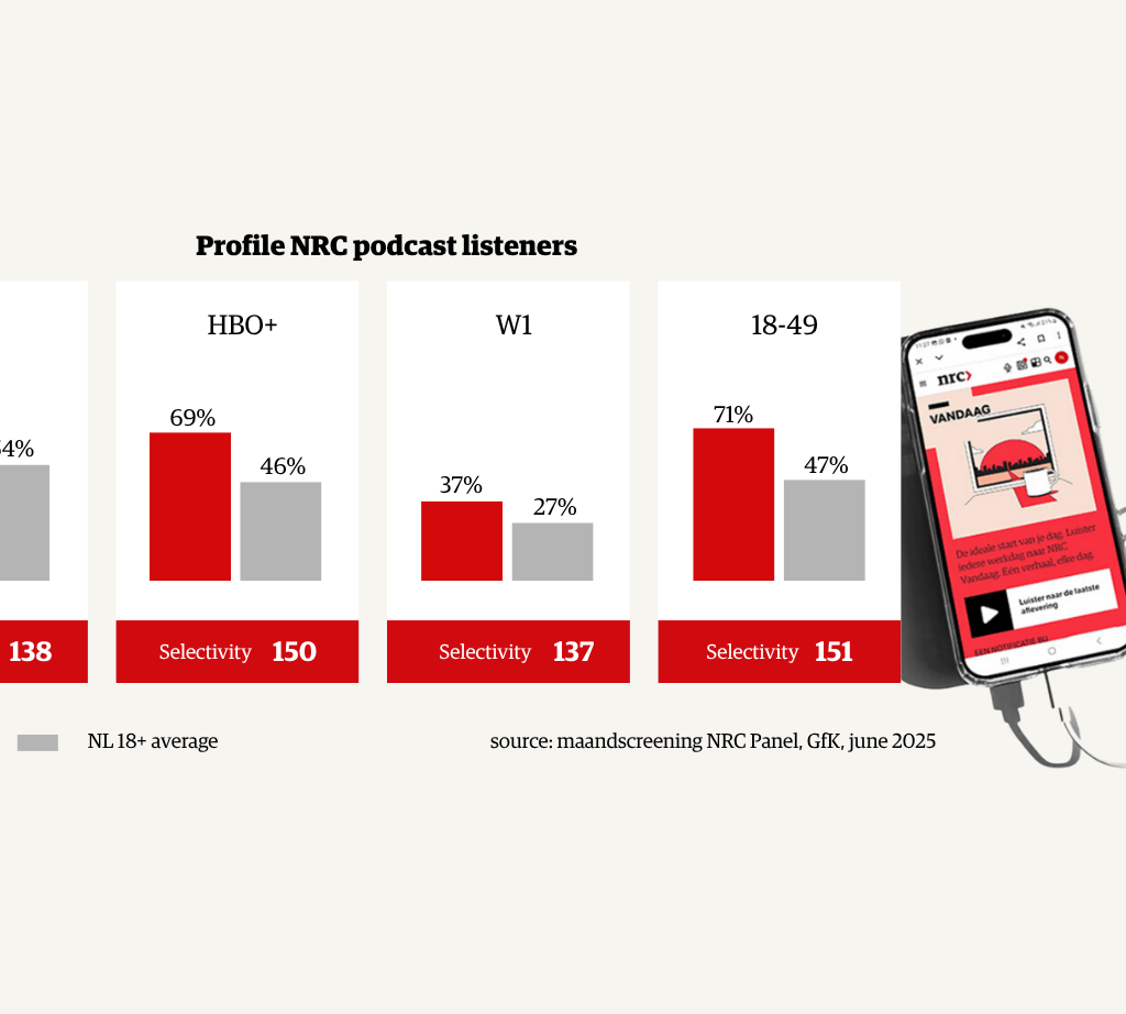 No less than 72% of NRC podcast listeners are between 18 and 49 years old, and 66% have a higher education degree. In addition, 71% belong to the highest social class (AB1), and 40% fall within the highest affluence class (W1). Through audio, NRC reaches a select group of listeners who consciously choose depth, reliability, and journalistic quality — often during moments of full attention.
